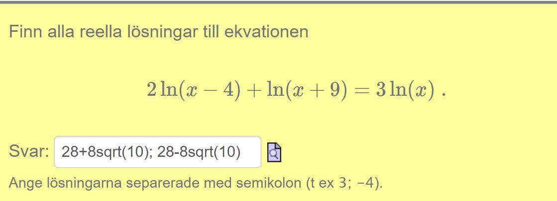 kan inte vara en lösning då det är mindre än 4. Om x är mindre än 4 blir (x-4) i In(x-4) negativ.