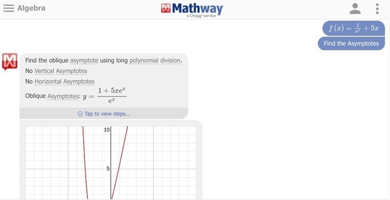 Mathway säger att funktionen inte har någon horisontell eller vertikal asymptot men 5x är ingetdera.