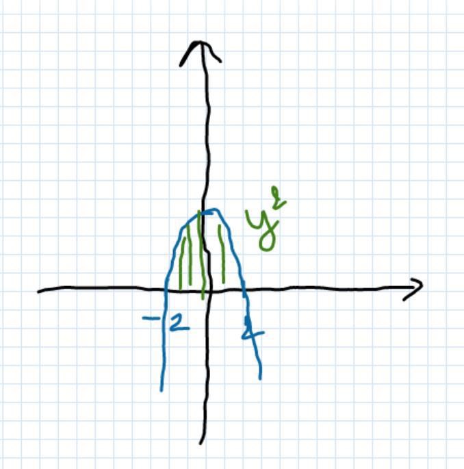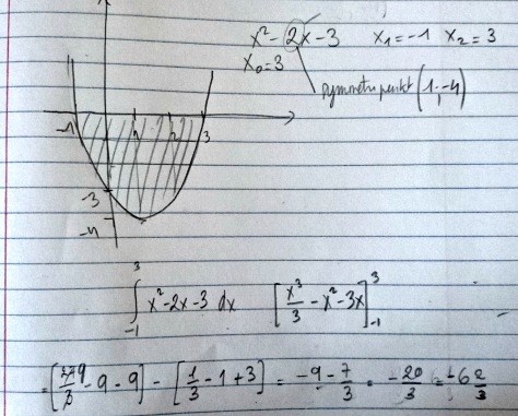 Arean hänger under x-axeln... Integralen är negativt men lite små om man räknar kvadraterna... Hoppsan jag ser en slarv fel (jag har glömt en faktor 2, det är så mycket press!!). Men pålitlig miniräknare säger -32/3, som är 10 kvadrater och 2/3 delar...