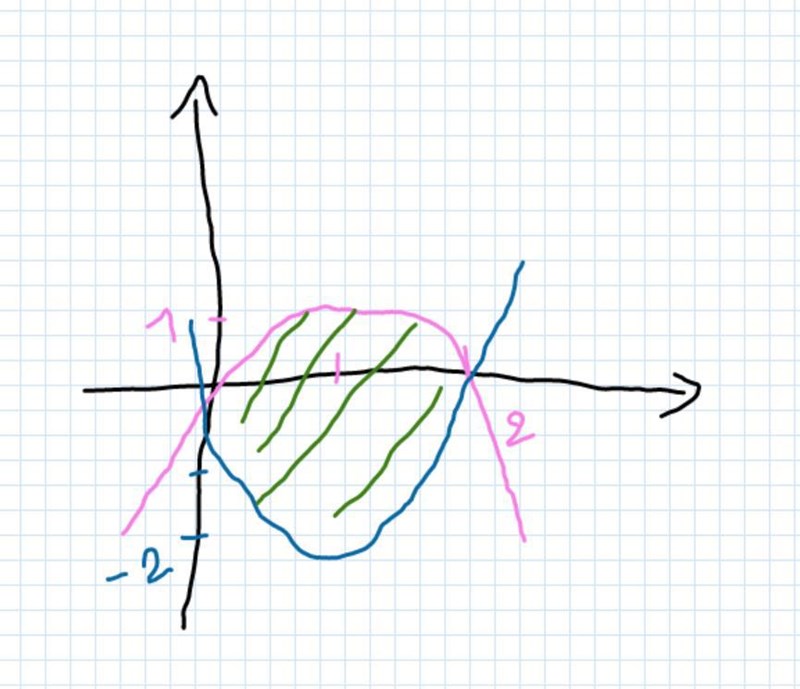 Tänk alltid "övre funktion" minus "undre funktion" när du ska beräkna area så kommer det att gå bra.
