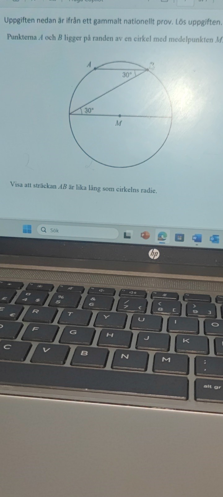 jag började med att rita två streckor från m till a och från m till B då vet jag att de är lika långa eftersom bägge är radien och går från mittpunkten till cirkels Strand så eftersom de är lika stora så blir vinklarna lika stora på dem och då får jag en triangel som jag har markerat med blå färg Triangeln MBA men jag får också en annan likhetstriangel som går från vänster till m från den punkten till B och sedan tillbaka till m och eftersom jag vet att en vinkel är 30 så måste den andra också vara 30 och den andra ingår i den blå Triangelnså tänkte jag för någon anledning att det måste vara hälften så att hela din Kent blir 60 men jag tror inte jag får göra så på prov fall eftersom jag måste veta varför jag antog att resten skulle vara 30 det kan lika gärna vara 31 eller något sånt men så jag undrar om det är rätt eller inte men i alla fall om vi antar och går på scenariumet att det var 30 så blir så blir det en likb liksidig triangel eftersom alla vinklar är lika stora och om alla vinklar är lika stora som måste alla sätt beror var lika stora därför att sträcka AB lika stor som radien men är osäker