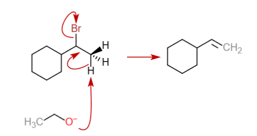 Jag håller på att jobba med en uppgift angående en eliminationsreaktion. Jag vet att det antingen är en E1- eller E2-reaktion, och ska avgöra vilken av dessa det är och också hur den förlöper. Substratet är bromoetylcyklohexan i närvaro av etoxidjoner och etanol. Mitt resonemang är att det borde vara en E2-reaktion, eftersom etoxidjonen är en stark bas. Samtidigt är etanol ett polärt och protiskt lösningsmedel, vilket skulle kunna stabilisera eventuella karbokatintermediärer. Alkylhaliden ger ingen användbar information eftersom den är sekundär. Trots lösningsmedlets eventuella stabiliserande förmåga verkar det ganska entydigt att basen gör att reaktionen är en E2-mekanism.