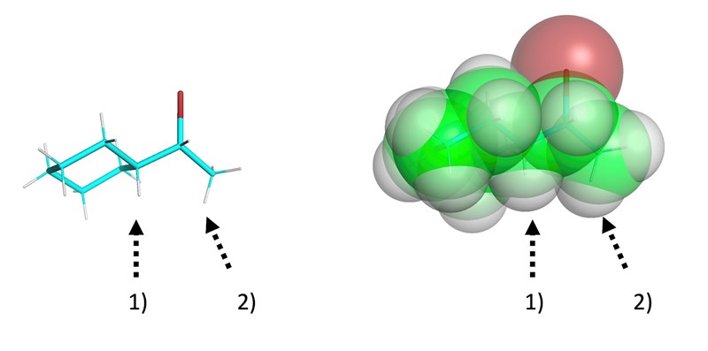 Det blir nog enklare att tänka sig det med en byggsats i handen, men bilden nedan illustrerar hyfsat vad jag syftade på tidigare, skillnaden mellan hur lättåtkomligt vätet i cyklohexan 1) är jämfört med ett av vätena i metylgruppen 2).