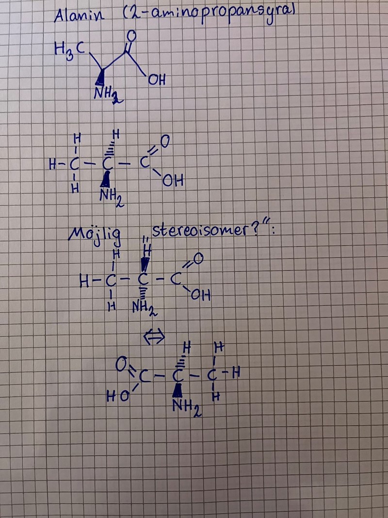 Jag sitter med en uppgift där man ska plocka fram alanins spegelbildsisomerer. Jag är lite osäker på hur man ska tänka men jag har gjort ett försök enligt bilden nedan: