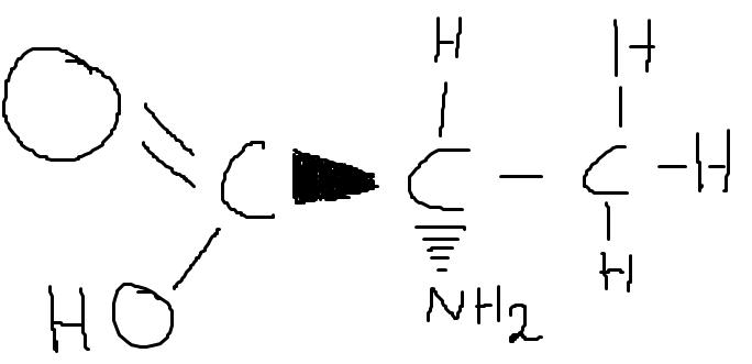 Jag bara gissade att väteatomen på det asymmetriska kolet skulle gå in i planet (i min molekyl längst upp) eftersom ingen annan bindning verkade göra det och kolet ju är sp3-hybridiserat. Men hade det funnits något sätt att lista ut det bara med vetskapen att Alanin är 2-aminopropansyra?
