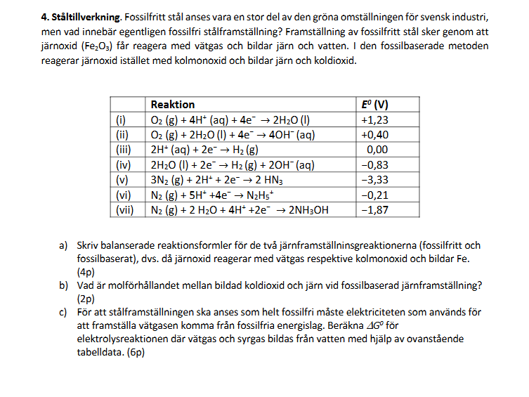 Jag tänkte att anodreaktionen borde vara , och det tyckte facit också. Vi noterar att vi måste lägga på en överspänning (kanske runt ) för att denna reaktion ens ska äga rum.