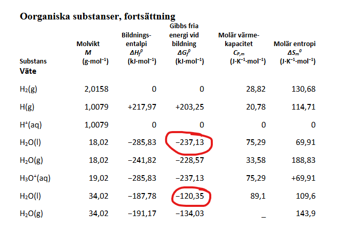 Jag såg nu att min formelsamling hade TVÅ tabellerade värden för Gibbs fria energi vid bildning för vatten...