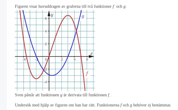 Hej, i den här uppgiften frågar de om f är derivatan till g. Alltså, nollpunkterna för g är f:s extrempunkter vilket gör så att det skulle kunna vara derivatan. Dock är det inte det, vilket är delen jag inte förstår.