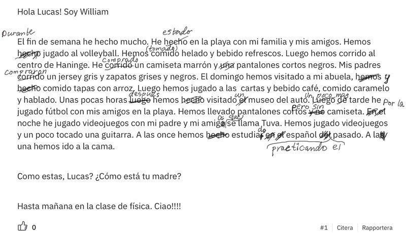 El fin de semana he hecho mucho. He hecho en la playa con mi familia y mis amigos. Hemos hecho jugado al volleyball. Hemos comido helado y bebido refrescos. Luego hemos corrido al centro de Haninge. He corrido un camiseta marrón y una pantalones cortos negros. Mis padres corrido un jersey gris y zapatos grises y negros. El domingo hemos visitado a mi abuela, hemos hecho comido tapas con arroz. Luego hemos jugado a las cartas y bebido café, comido caramelo y hablado. Unas pocas horas luego hemos hecho visitado el museo del auto. Luego de tarde he jugado fútbol con mis amigos en la playa. Hemos llevado pantalones cortos y no camiseta. En el noche he jugado videojuegos con mi padre y mi amigo se llama Tuva. Hemos jugado videojuegos y un poco tocado una guitarra. A las once hemos hecho estudiar en el español del pasado. A las una hemos ido a la cama.