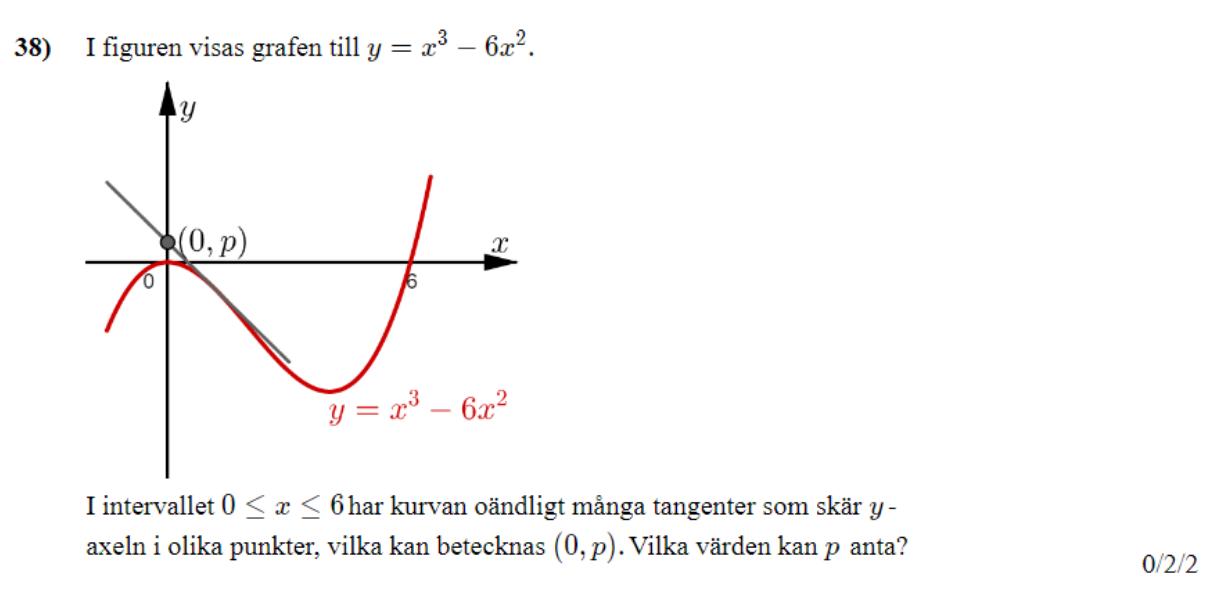 Sedan kan man verifiera med hjälp av andraderivata att just x=2 råkar vara en maximipunkt. Det är den enda maximipunkten funktionen har, och den ligger i intervallet [0, 6]. Därför erhåller man det största värdet på p vid x=2. Sedan gäller det att leta fram det minsta värdet på p.