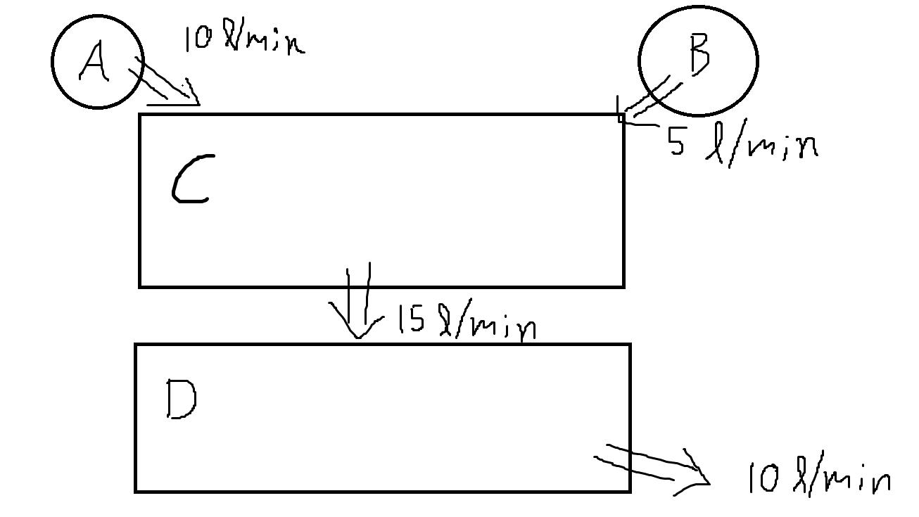 Två behållare, A och B, läcker ut salthaltigt vatten med en hastighet 10 L/min respektive 5 L/min i en behållare C som ursprungligen innehöll 100 L rent vatten. Volymprocenten salt i A är 4 % och i B 10 %. Det rinner samtidigt ut vatten ur C in i en behållare D (som också ursprungligen hade 100 L rent vatten) med hastigheten 15 L/min. Ur D rinner det 10 L/min. Bestäm volymprocenten salt i behållare D efter 10 minuter.