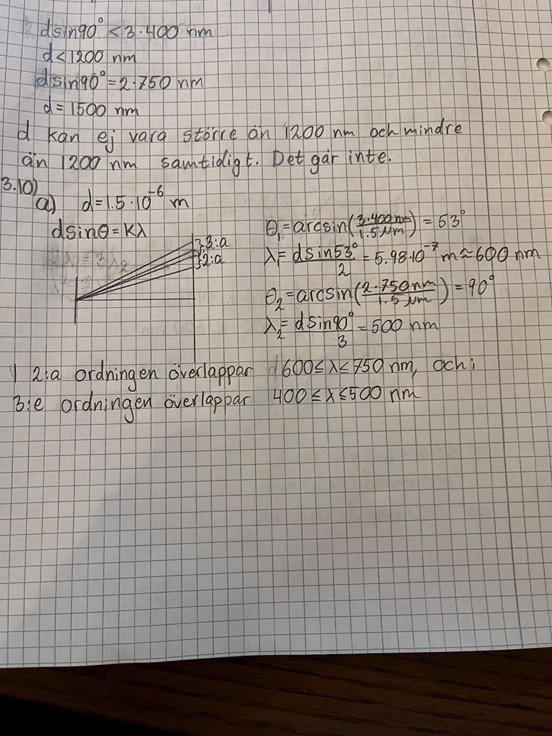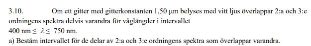 Men jag förstår inte riktigt vad det är jag har räknat fram. Innebär detta att ljus med våglängden [600 nm, 750 nm] i det 2:a maximat kommer dela yta (om man lyser på typ en vägg) med ljus med våglängden [400 nm, 500 nm] i det 3:e maximat?