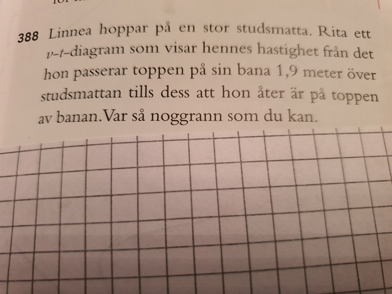 Jag uppskattar snabb hjälp då jag har prov imon. Förstår bara att v_0 = 0 då diagrammet ska ritas från den stund hon är mitt uppe i luften. Sedan vet jag inte.
