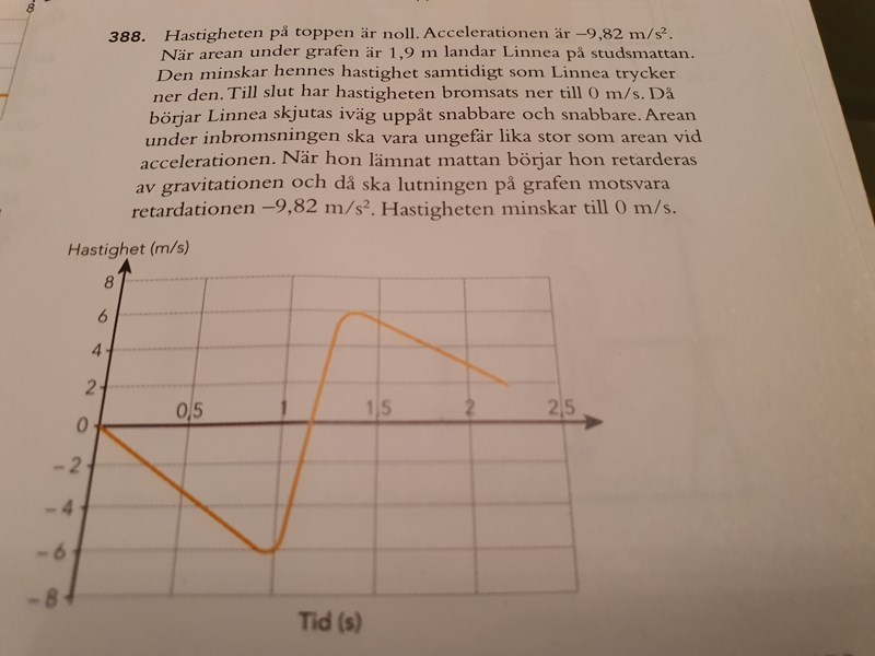 Det står fel i facit eftersom deras graf är felaktig. Exempelvis skriver de att arean under grafen ska vara 1.9 m men det är uppenbart att den är 3 m om du läser av i diagrammet. Lutningen på grafen ska vara -9.82 m/s2 men deras är närmre -6 m/s2 osv.
