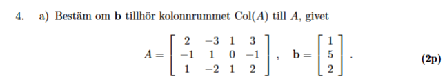 Om jag har förstått det hela rätt så innebär att att finns i mängden av alla linjärkombinationer av kolonnerna i . Så då tänker jag att man kan ställa upp det som en augmenterad matris och sedan gaussa ned den till reducerad trappstegsform. Är detta en OK strategi? Vad händer om det inte finns några lösningar? Märker man det då man gaussar?
