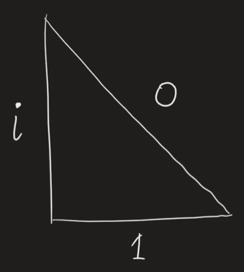 Det första vore att vi ser dessa som tal i . Vi utgår från origo och ritar ut i och 1. Sedan drar vi då en linje mellan dessa och får då triangeln. Men sen ser vi att detta blir väldigt konstigt då normen av i och 1 är 1 (som tal i ), men normen av 0 är 0.