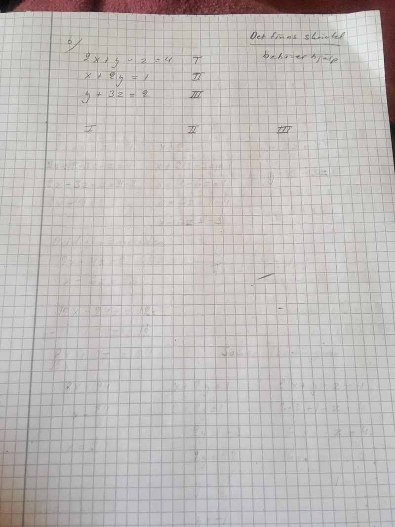 Päivi skrev :Dr. G skrev :Smaragdalena skrev :Har du satt in dina värden på x, y och z i ursprungsekvationerna? Om det stämmer i alla tre, så är lösningen rätt.