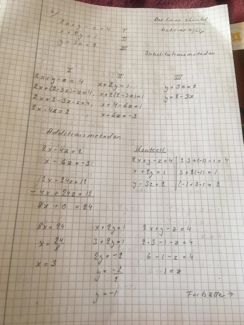 Additions metoden som jag använder. Det sättet är jag van att använda. Måste byta tecken på ekvationen 2. När det gäller två obekanta är det lättare hålla reda på, men svårare med tre. Jag har försökt ta lättaste vägen för kunna substituera det här. Väljer det som är ensam y eller z eller liknande. Går det inte, då dividerar jag för att få det ensamt. Jag försökte ha koll, så jag inte räknar fel och glömmer något.