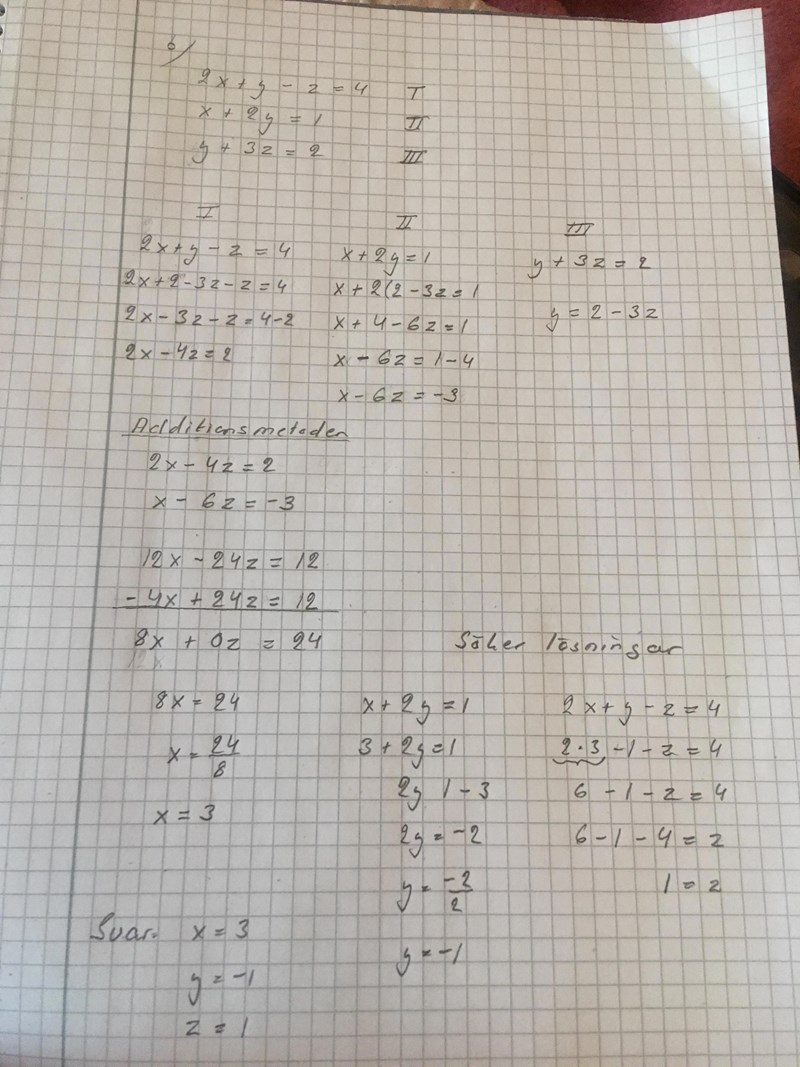 Smaragdalena skrev :Har du satt in dina värden på x, y och z i ursprungsekvationerna? Om det stämmer i alla tre, så är lösningen rätt.