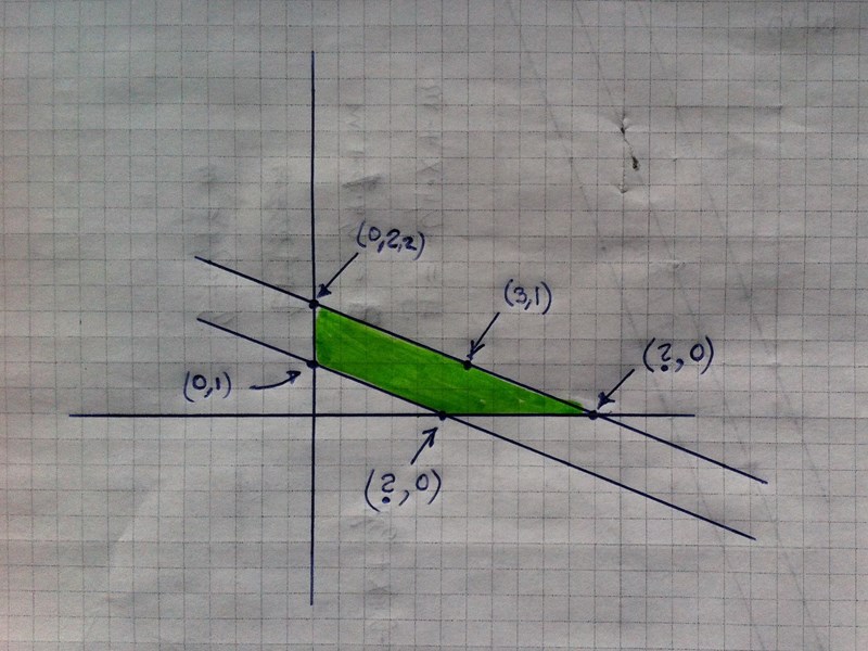 En linje går genom punkten (3, 1) och är parallell med en annan linje 0,8x + 2y – 2 = 0. De båda linjerna begränsar tillsammans med koordinataxlarna ett område. Beräkna detta områdes area.