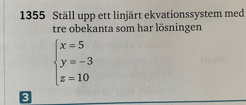När du ska ställa upp ekvationssystemet kan det vara bra att tänka på det sätt du verkar ha gjort, dvs att hitta på tre vänsterled i form av uttryck med x, y och z och sedan, med hjälp av de givna värdena, räkna ut respektive högerled.