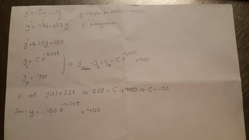 Ställ upp en differentialekvation som visar mängden medicin i kroppen som funktion av tiden