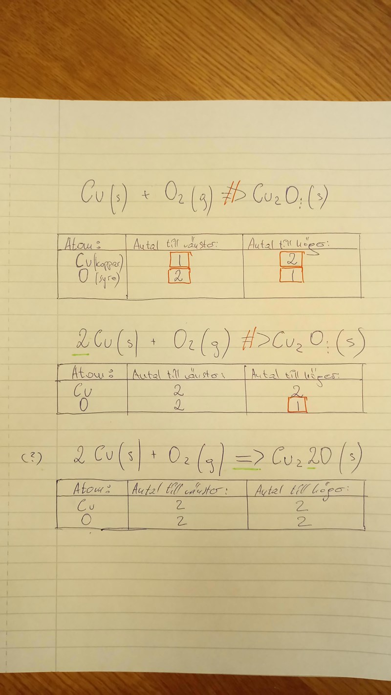Eftersom du har 2 syreatomer före reaktionsen måste du ha 2 syreatomer efter reaktionen också.Hur många Cu2O behövs det för att det skall vara två syreatomer? Hur många kopparatomer finns det alltså på högersidan? Hur många behövs det på vänstersidan?