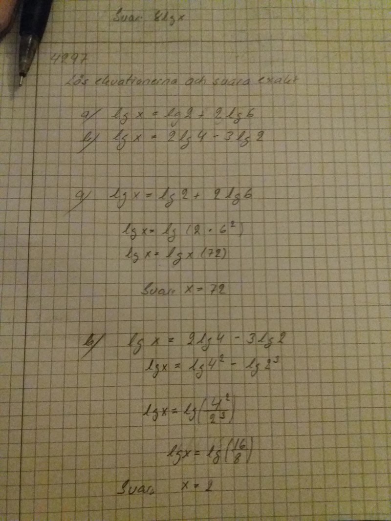 På b) kan du göra det lite snabbare genom att: lg(x)=4lg(2)-3lg(2)⇒lg(x)=lg(2)⇒x=2