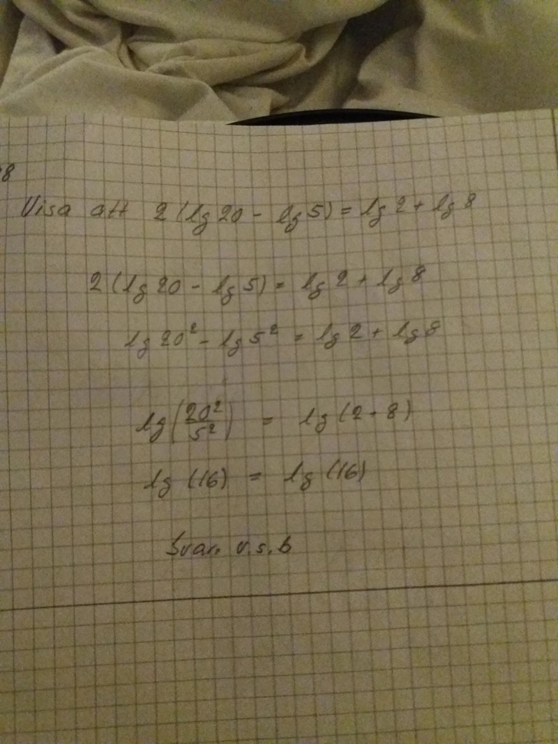 På din andra bild vill dom att du ska visa (vilket du har gjort korrekt, men jag antar att dom vill att du ska redovisa att du kan skriva om det till lg2+lg(8) och inte lg(16)).