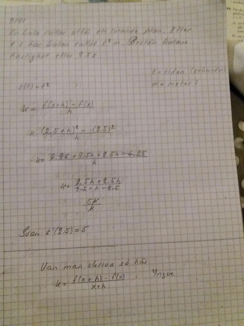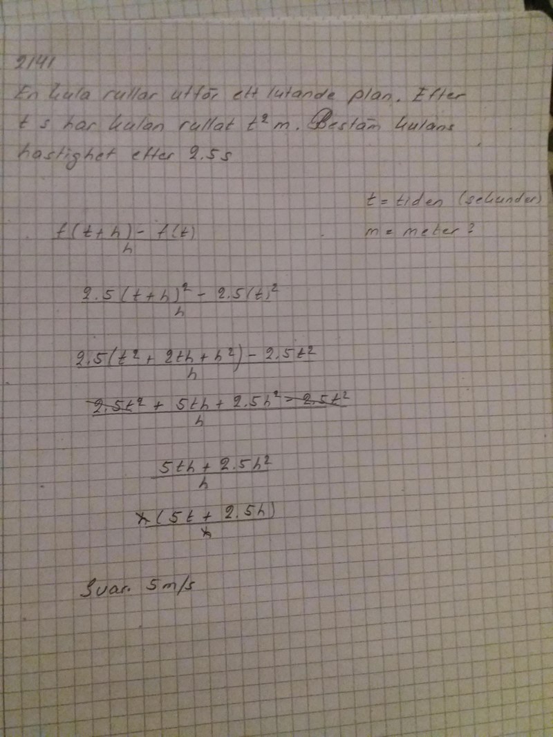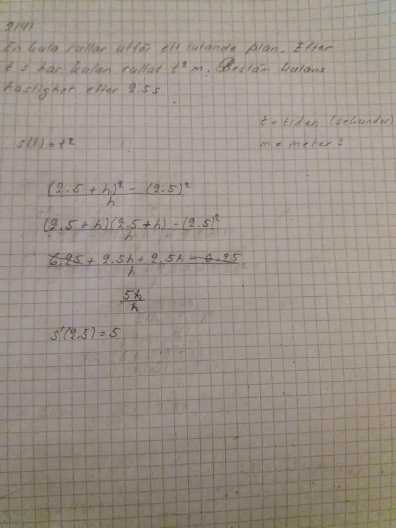 1. Ställ upp ändringskvoten vid t = 2.5 sekunder. Förenkla.