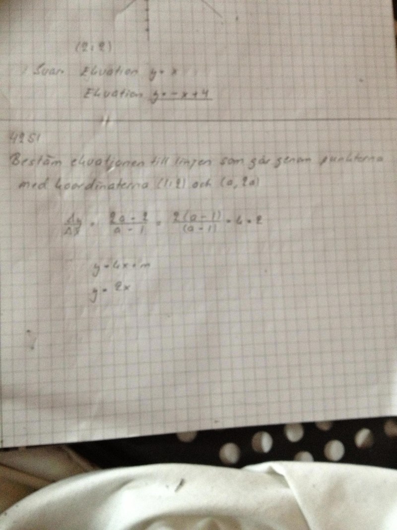 Päivi skrev :Bestäm ekvationen till linjen som går genom punkterna med koordinaterna (1:2) och (a: 2a)