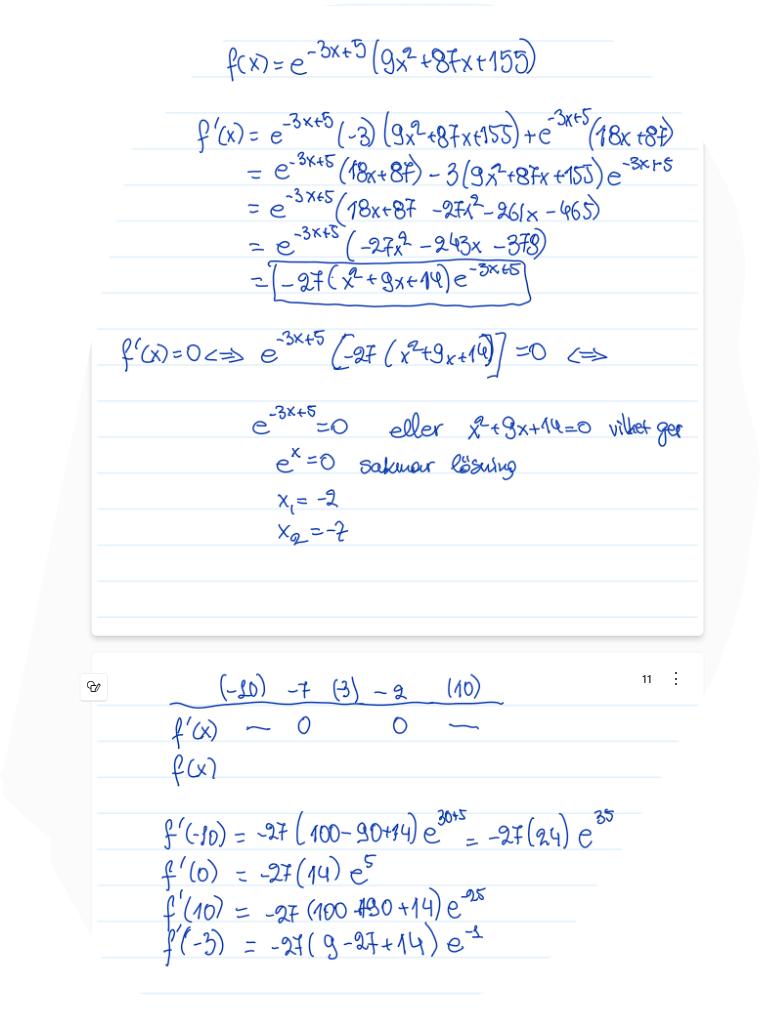 Jag vill hitta de lokala max och min till funktionen. Jag har fastanat vid tabellen. Jag förstår inte om derivatan av funktionen blir + eller - pga talet e
