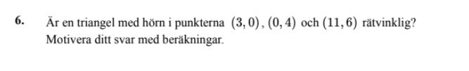 Är en triangel med hörn i punkterna (3,0) (0,4) och (11,6) rätvinklig?