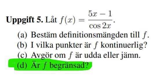 Denna antar jag inte är begränsad eftersom att cos kan anta värden mellan -1 och 1 men x i täljaren gör att alla kan antas och därmed inte begränsad.