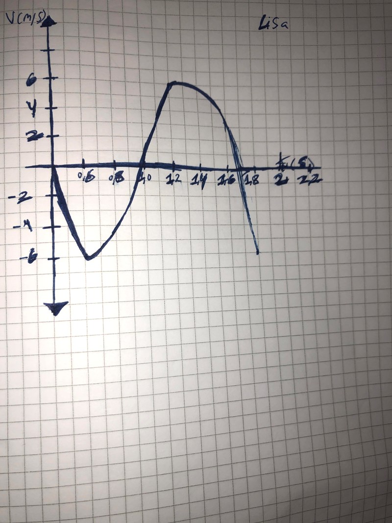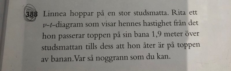 Börja från högsta punkten vid t=0. Där är v=0, det har du gjort rätt. Men hur ser v(t) ut när hon faller ner till studsmattan? Finns det någon användbar formel, och hur lång tid tar det tills hon landar på studsmattan?