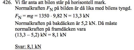 En bil väger 1350 kg och normalkraften på bakdäcken är totalt 5,2kN. Hur stor är normalkraften på framdäcken?