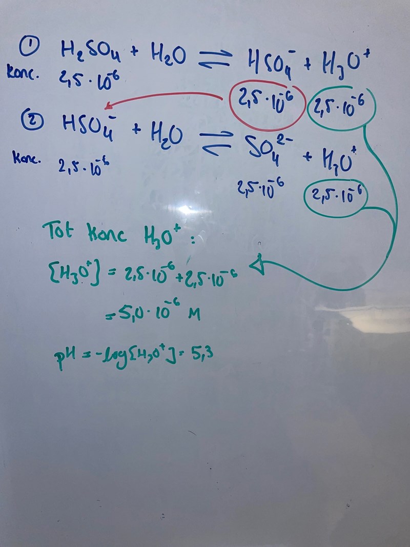 Hej, på den här uppgiften ska inte svaret vara 5,6pH eftersom den är fullständigt protolyserad? Då borde jag ha koncentrationen för H c=2,5 x 10⁻⁶. (D)