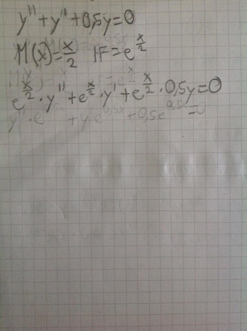 Bestäm den allmänna lösningen till y"+y'+0,5y=0. M(x)=x/2 => IF=e^(x/2).