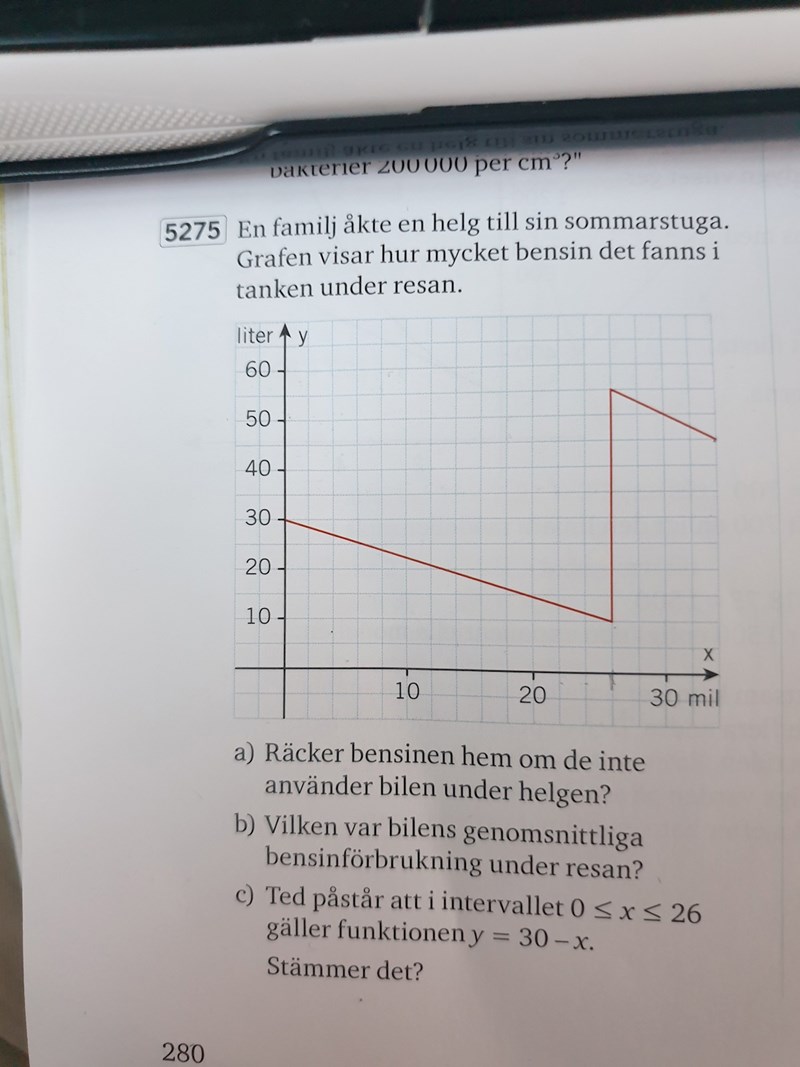 Bränslet i tanken efter 20 mil är enligt grafen något lägre än 15 liter