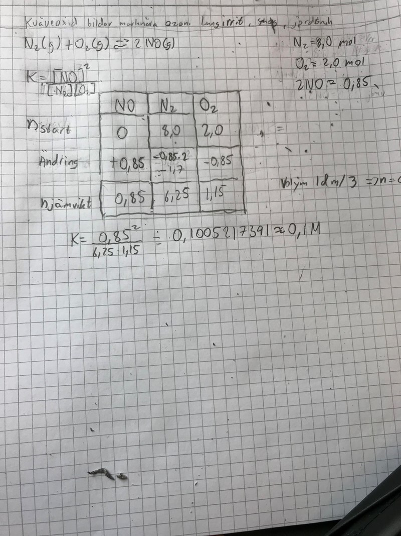 Det beror på hur frågan var formulerad, men jag tror inte det - om det bildas 0,85 mol NO har det förbrukats 0,425 mol kvävgas och lika mycket syrgas.