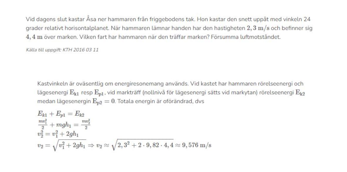 Är verkligen kastvinkeln oväsentlig vid användningen av energiprincipen? Åsa kastar ju inte hammaren horisontellt, så i min mening kommer hammaren att stiga tills hammarens hastighet i y-led når noll och sedan vända mot marken... Och om det stämmer så är ju inte höjden som används i den potentiella energin korrekt eftersom den borde vara större än 4,4 meter...