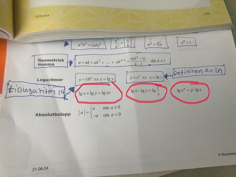 Hej. jag läser på formel bladet. Vet någon om dom 3 röd markerade lagarna för logaritmer som finns på formel bladet kommmer upp I kursen Matematil 3B eller Matematik 3C?