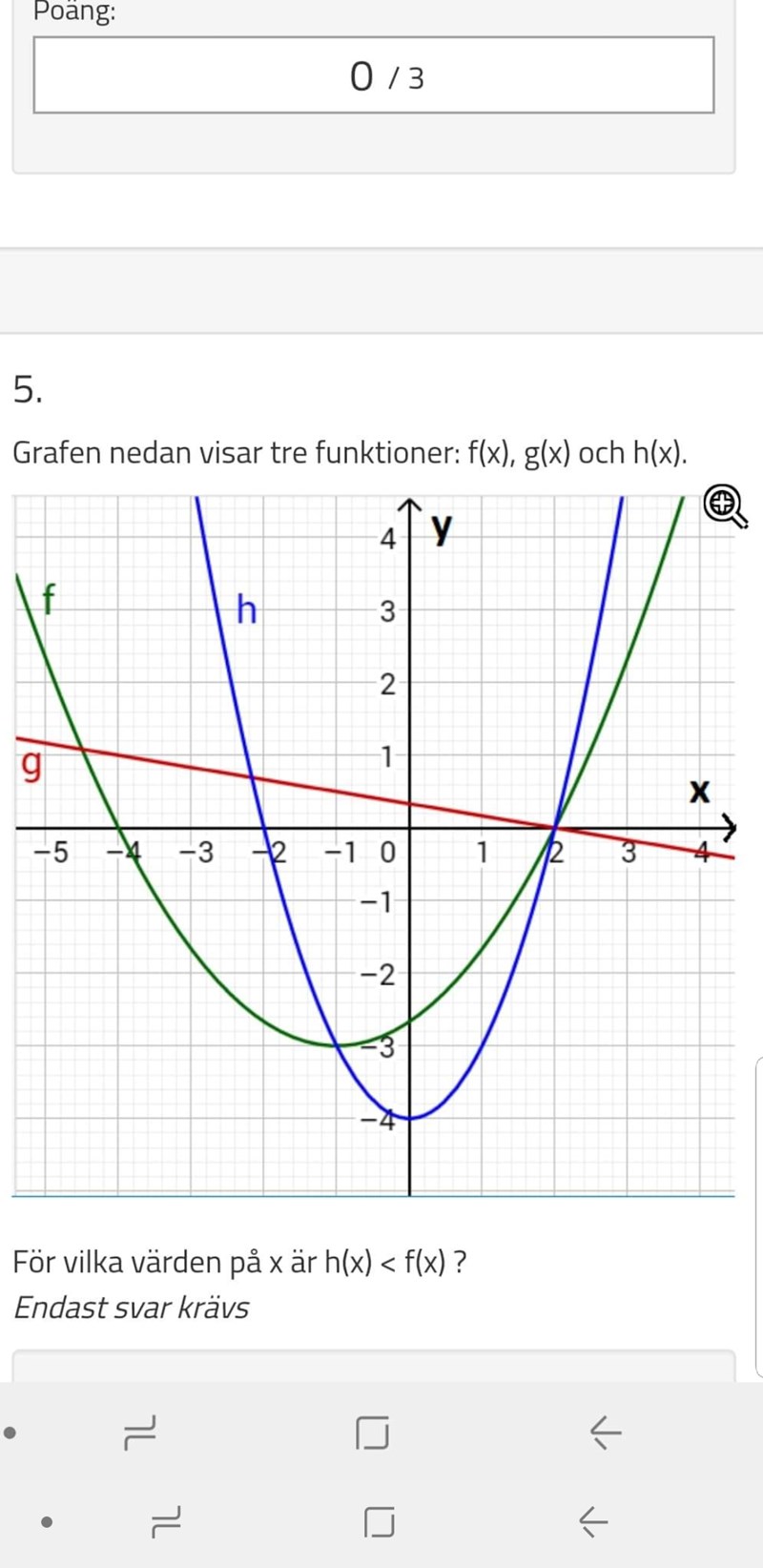Nej. Frågan kan "översättas" till "För vilka x-värden ligger den blå kurvan nedanför den gröna?".