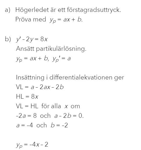 I det här fallet gissar man en lösning på diffekvationen, och eftersom HL - b-uppgiften är ett förstagradsuttryck gissar man att partikulärlösingen också är ett förstagradsuttryck. Alla förstagradsfunktioner kan skrivas som y = ax+b. Derivatan av denna funktion är y' = a. Om man sätter in y och y' i diffekvationen y'-2y = 8x får man a-2ax-2b = 8x. Om detta skall stämma för alla värden på x måste det gälla att -2a = 8 och att a-2b = 0. Detta stämmer om a = -4 och b = -2. Det betyder att partikulärlsningen är y = -4x-2.