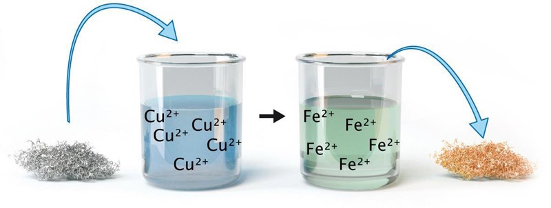man lägger järn( stålull) i koppar joner då när järnet o lösningen reagerar ,järn är öadla än kopper då kommer järnet lämna electroner o så kommer koppar få två electroner o kommer bli till metallen koppar igen så den går fasta i järnet men hur blivit lösningen järnjon( det klar att längre finns ingen jon av koppar i lösning men jag förstår inte hur järnet bli jon)?
