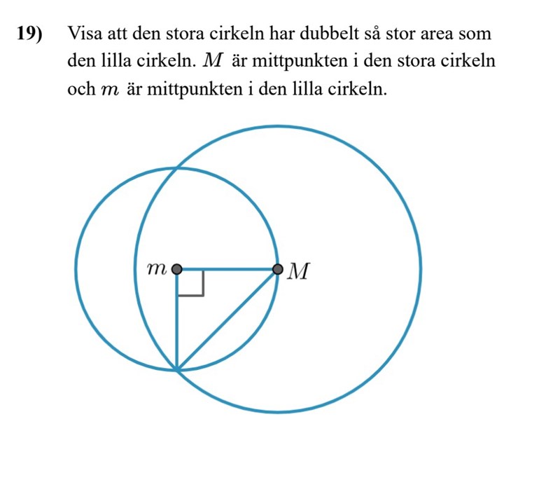 Area stora cirkeln = Pi * R^2 = Pi * 2r^2 = 2(Pi * r^2) = 2(Area lilla cirkeln). VSV.