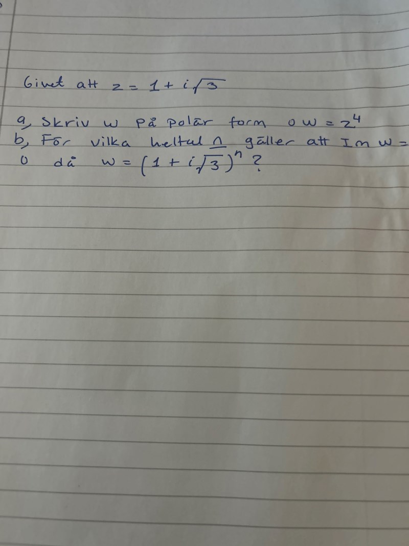 a) För att skriva ω=z^(4) i polär form, behöver vi först skriva z i polär form. Vi har z=1+i√3.