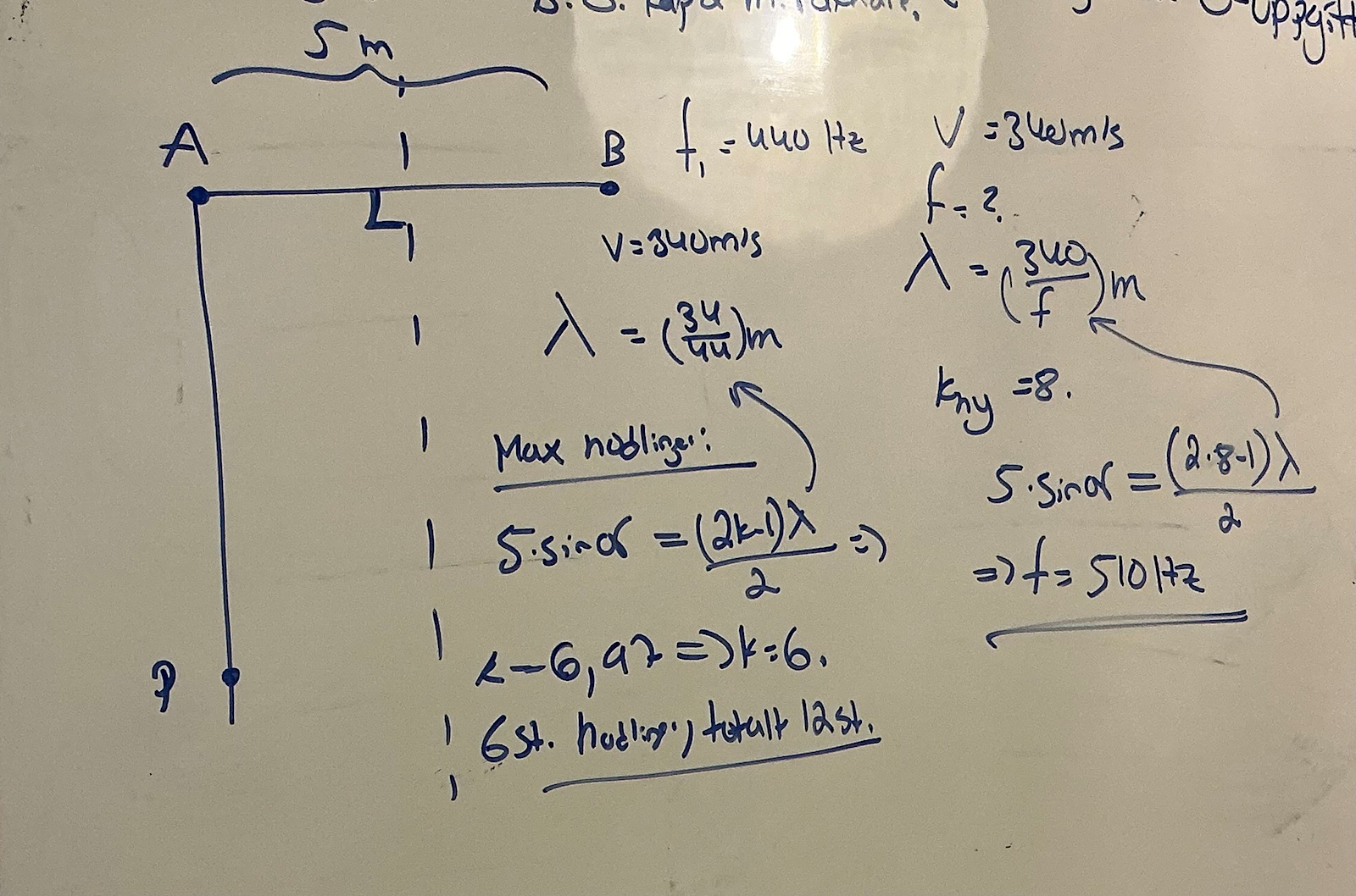 För d = 5 m och f = 440 Hz fås k = 6 i första delfrågan. I andra delfrågan skall k = 8 och då får jag svaret 510 Hz medan facit säger 520 Hz. Vad gör jag fel?
