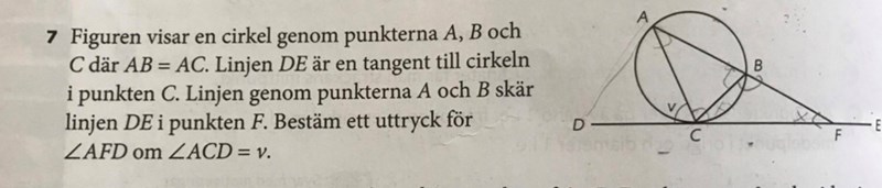 Den övre triangeln med har 2 röda vinklar som är lika stora . De kallar jag för z. Den övre vinkeln blir 180-2z (vinkelsumman i en triangel är 180 grader). Därefter använder jag mig av yttervinkelsatsen som säger att summan av motståndet vinklar i triangel ger yttervinkeln. Det betyder att v=(180-2z)+z=180-z.