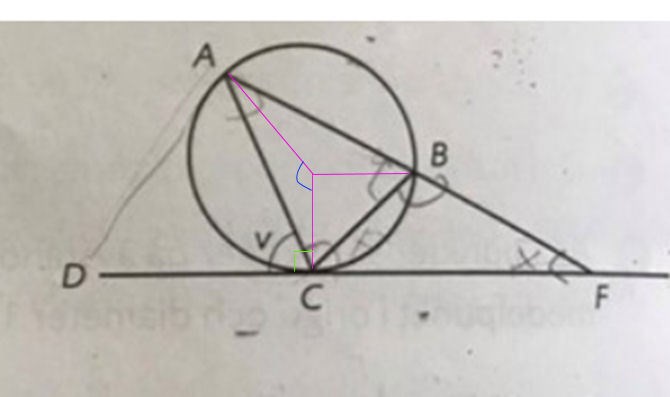 Dessutom får du en likbent triangel där en av de två lika vinklarna finns längst ner vid C - och den kan du så småningom också bestämma uttryckt i z. Vid C finns också en rät vinkel mellan tangenten och radien (grönmarkerad).